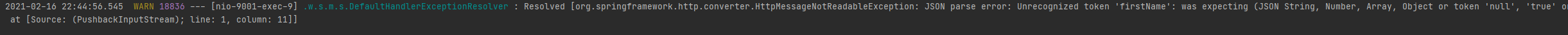 Resolved [org.springframework.http.converter.HttpMessageNotReadableException: JSON parse error: Unrecognized token 'firstName': was expecting (JSON String, Number, Array, Object or token 'null', 'true' or 'false'); nested exception is com.fasterxml.jackson.core.JsonParseException: Unrecognized token 'firstName': was expecting (JSON String, Number, Array, Object or token 'null', 'true' or 'false')